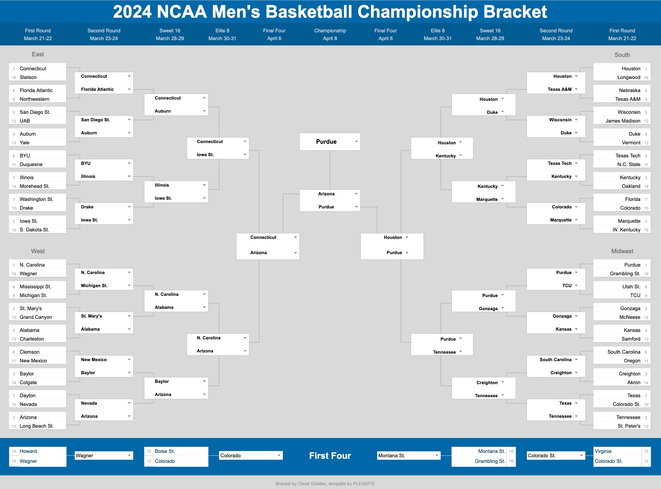 Good luck this year! The odds are slightly against us with UConn being so dominant, but they “only” have a 22.5% chance of winning it all - with so many people in your pool likely picking UConn, if the Huskies fall at any point, we should be well positioned to take a top spot in our pools with Purdue with a 14.9% chance of winning it all. Our second-top pick Arizona has a not-too-shabby 12.6% chance of winning given the advantage of shorter travel times during their play out in the West region.